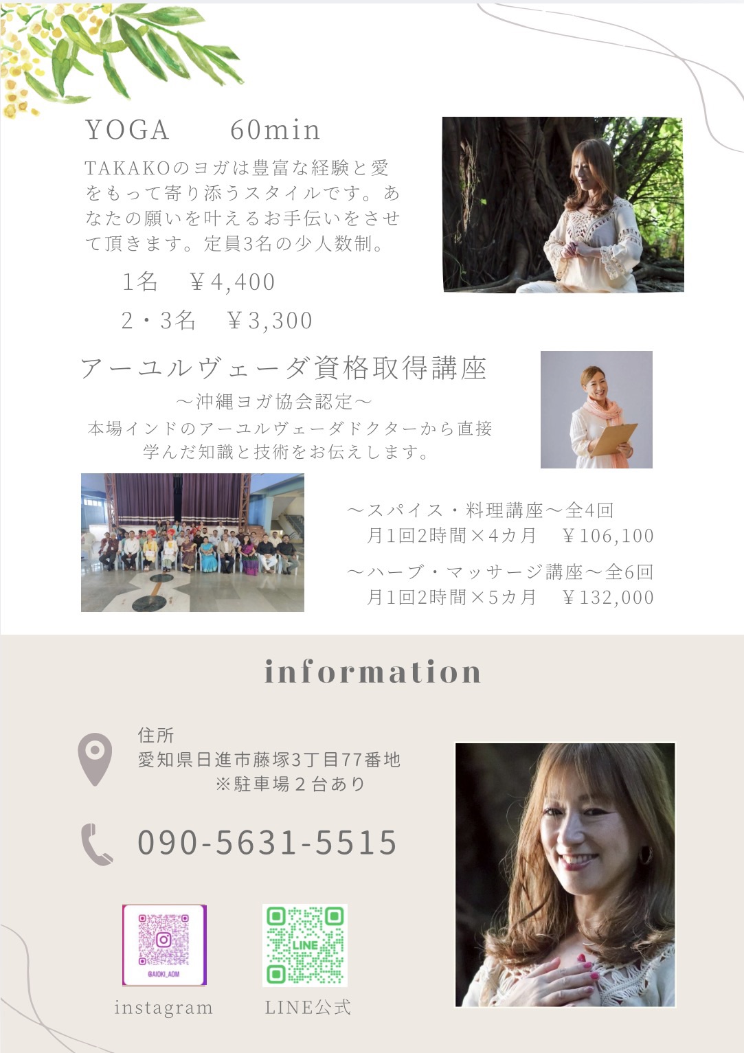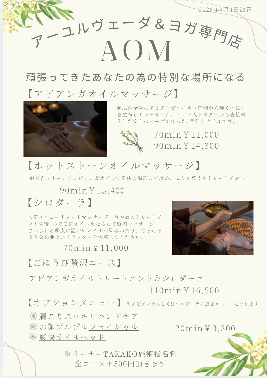 2026年4月1日より、オーナーTAKAKOによるアーユルヴェーダ施術に指名料として+500円を頂戴させていただきます。なお、基本施術料金はこれまで通り据え置きとさせていただきます。